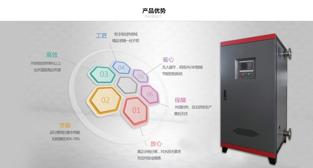 成功研發升級至第六代全新智能沈陽全導體電鍋爐機組。產品采用全導體加熱變頻技術,節能設計,熱效率高達98%以上,水電分離,獨有的故障自檢,防凍防干燒等十大保護;